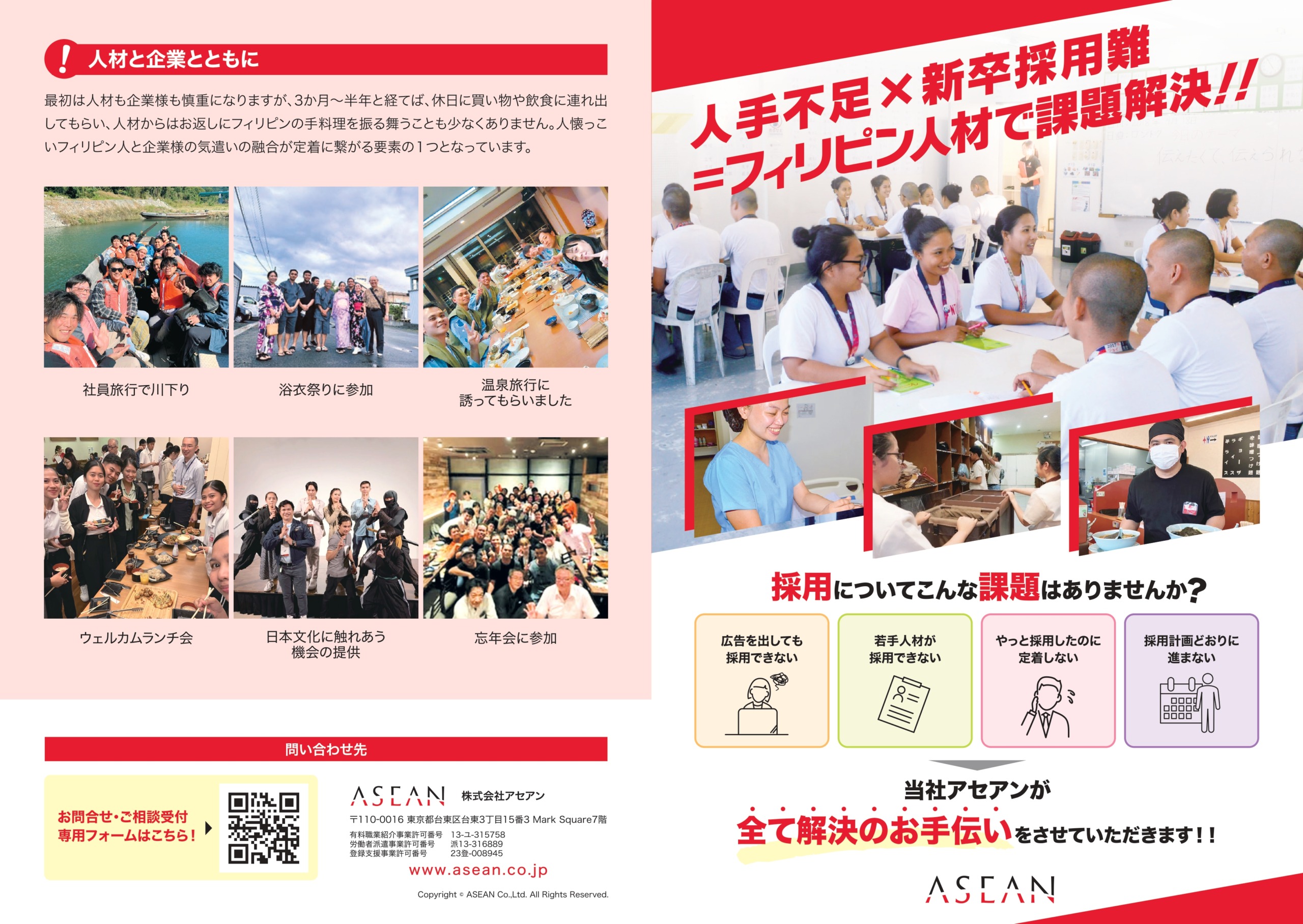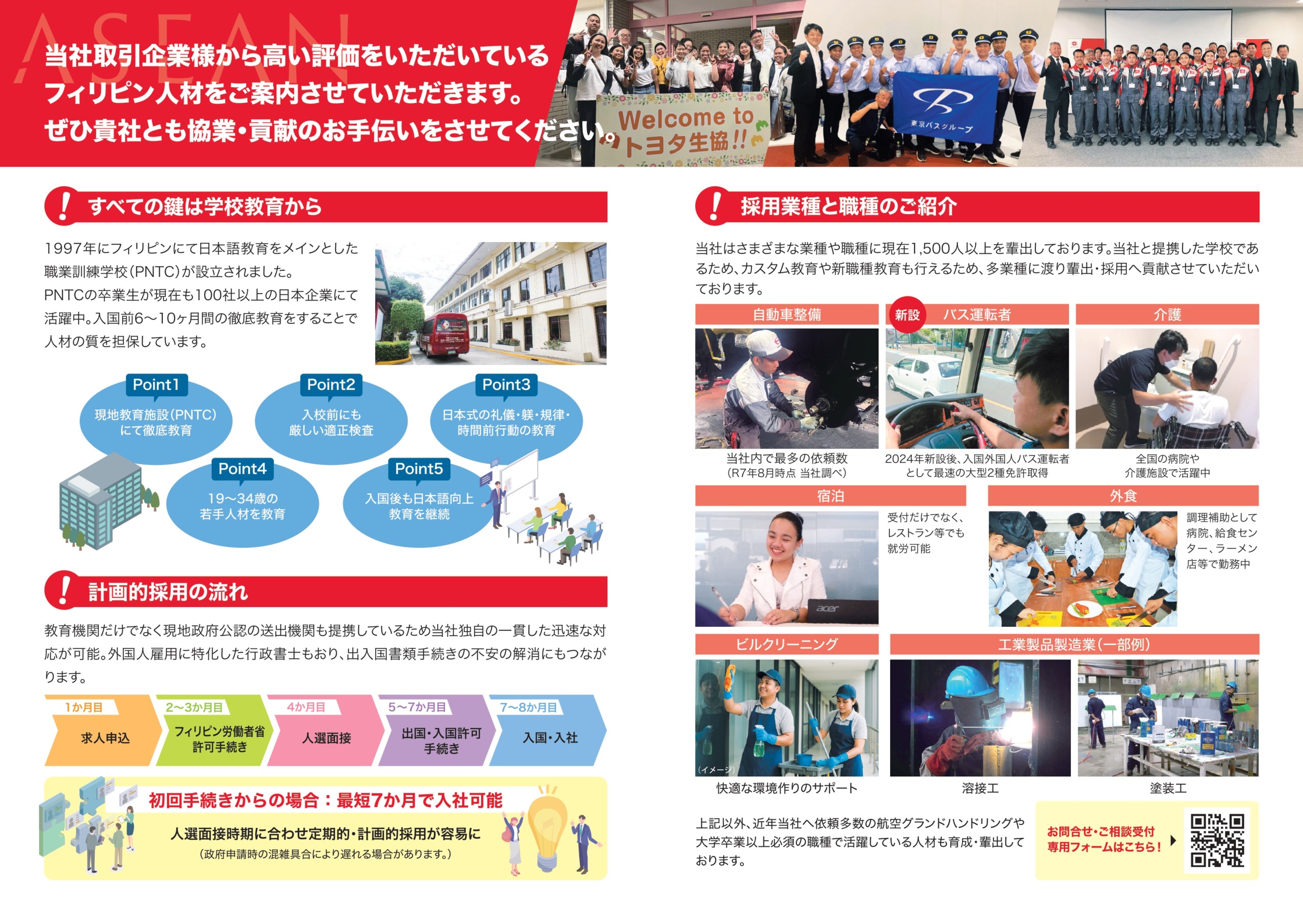 | 事業内容 | 外国人(主にフィリピン人)の各種事業 ・職業紹介事業 有料職業紹介事業許可番号 13-ユ-315758 ・人材派遣事業 労働者派遣事業許可番号 派13-316889 ・在留管理・生活支援事業 登録支援事業許可番号 23登-008945 ・教育事業 |